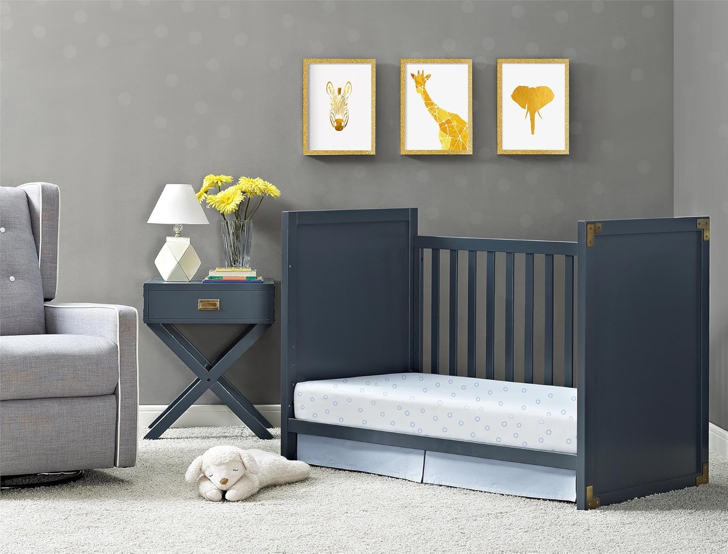 Easily converts into a toddler daybed once your child has outgrown the crib function. Inspired by Campaign style furniture pieces the charming crib has been constructed with robust wood and showcases decoratively adorned end panels with brass platedecorners. Combining campaign and modern style this charismatic crib is crafted with a sturdy wood construction and includes two full-size end panels.